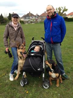 We still have a long way to go, but we are confident that with Sally we can do it. Today, after only three sessions with Sally we stood in the middle of an open park, and watched several big dogs galloping about whilst Max lay quietly at our feet, without a lead. We walked about pushing our baby in a pram with Max trotting at our heels, without a lead. We never thought we would see this! Tam said 'This is why we got a dog'; Ruth replied 'This is why we got Sally'!